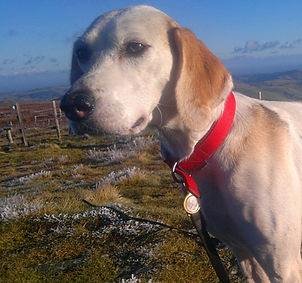 Elsa joined the family in October 2013. She is a trailhound rescued from a life of racing. She was petrified of almost everything but most especially of people; and quite specifically, people behind her. She came to her new life covered in scars, some of which are obviously from snares and barbed wire. At first she was afraid of me and it took days for her to come to me without cowering or running away. I have introduced her to select people in the house but Elsa has little or no experience of the world and its people.